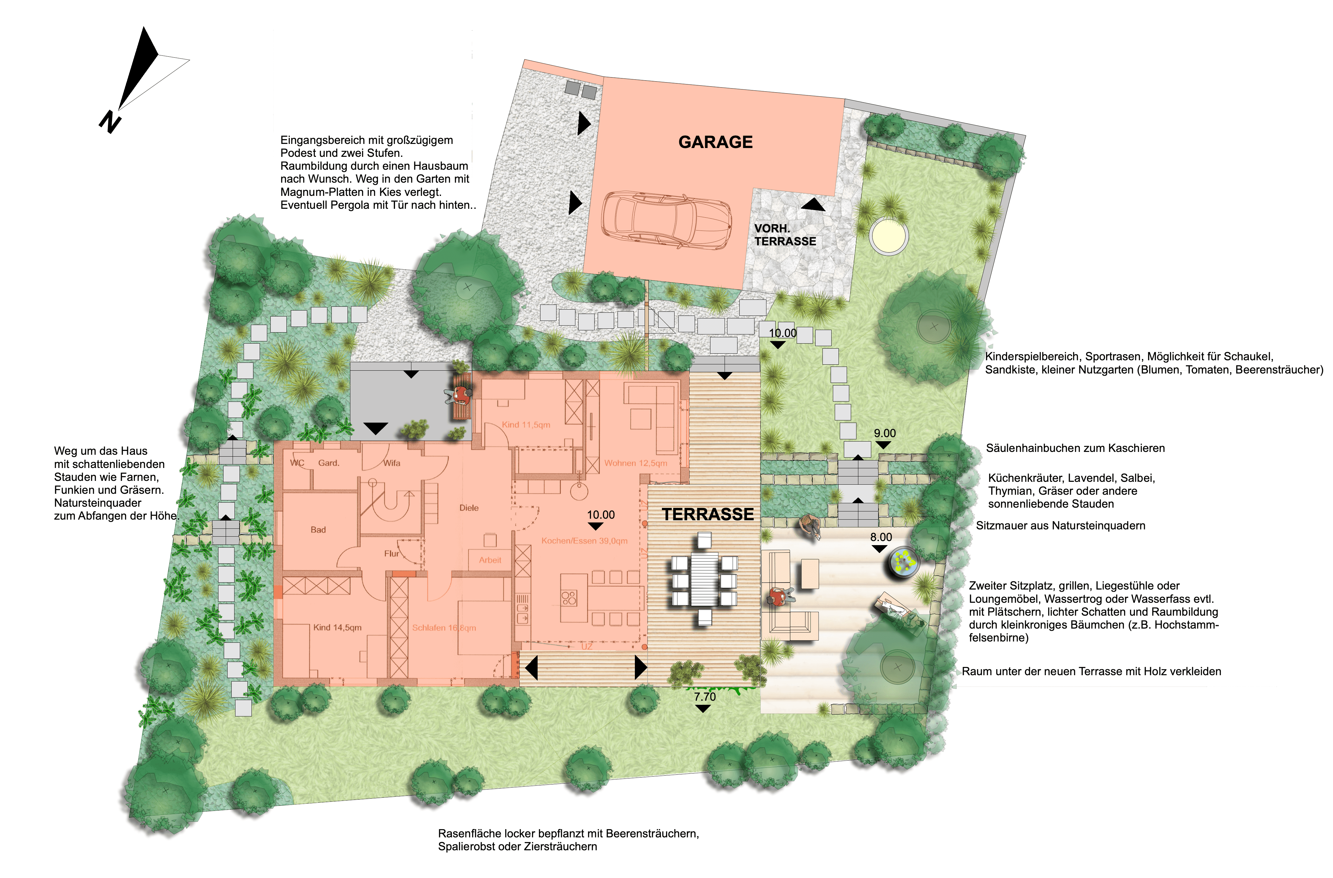 | Ausstattung Garten | Holzterrassen vor Wohnhaus, Vorgartengestaltung mit Stauden, zweiter Sitz- und Grillplatz, Rasenfläche mit Bäumen und Sitzbank, Zuwegung hinter dem Haus mit schattenliebenden Stauden, Farnen und Gräsern |