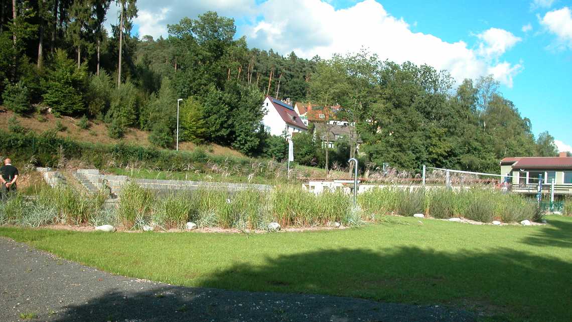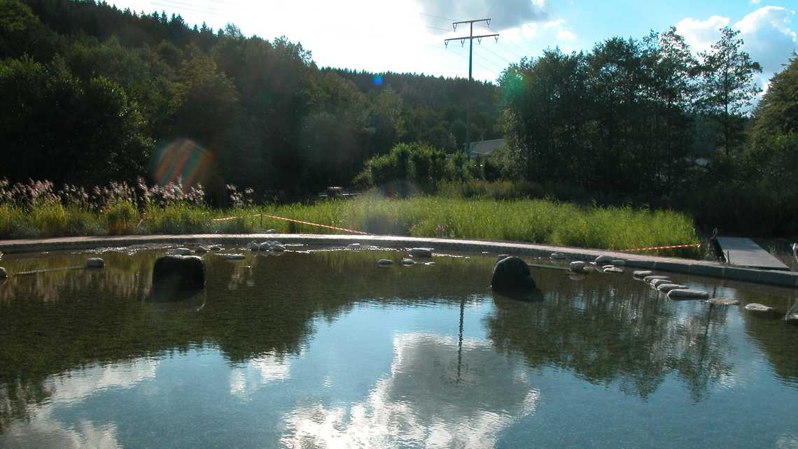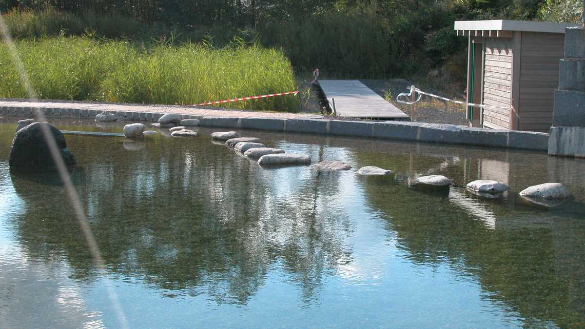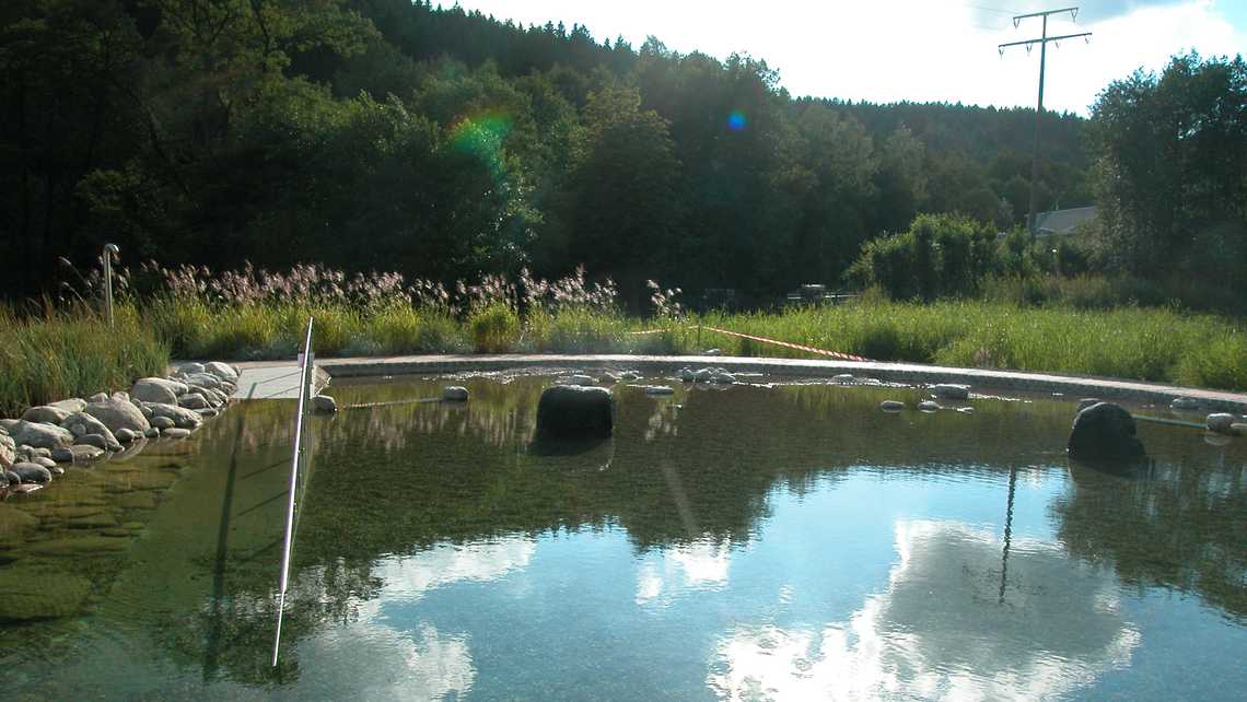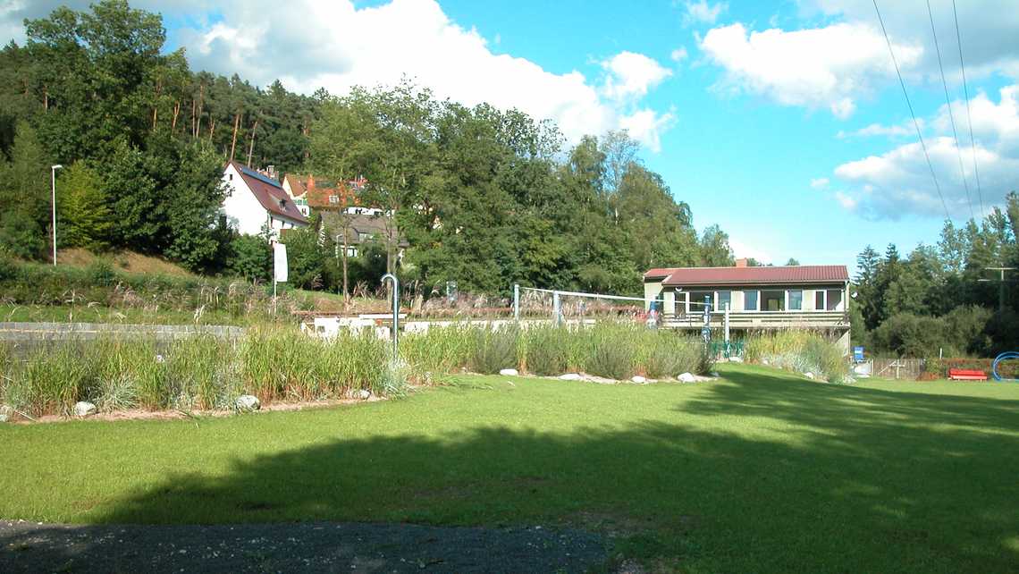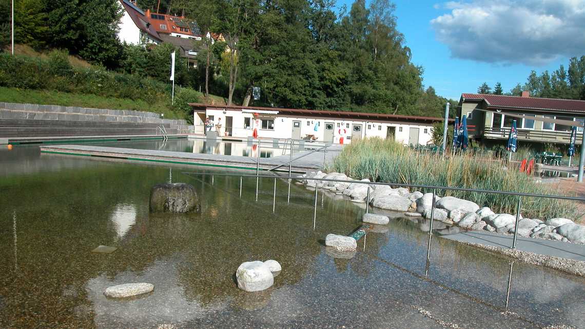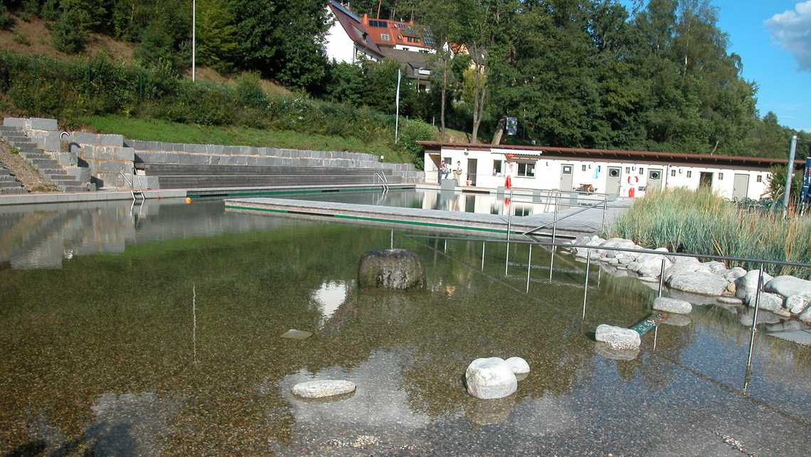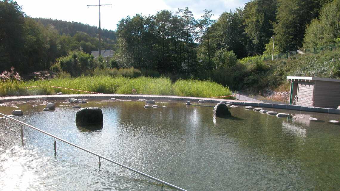 | Ausstattung | vier 25-m-Schwimmbahnen, Sprungstein mit, Holzstege aus Lärchenholz, Sonnenterrasse, Kiesstrand, Sprudelsteine im NS-Bereich, Wasserfall, Kinderbecken mit Bachlauf, Sprudelsteinen, Sprühschlange und Kleinkindrutsche, Spielplatz am Bach, Beachvolleyball. |