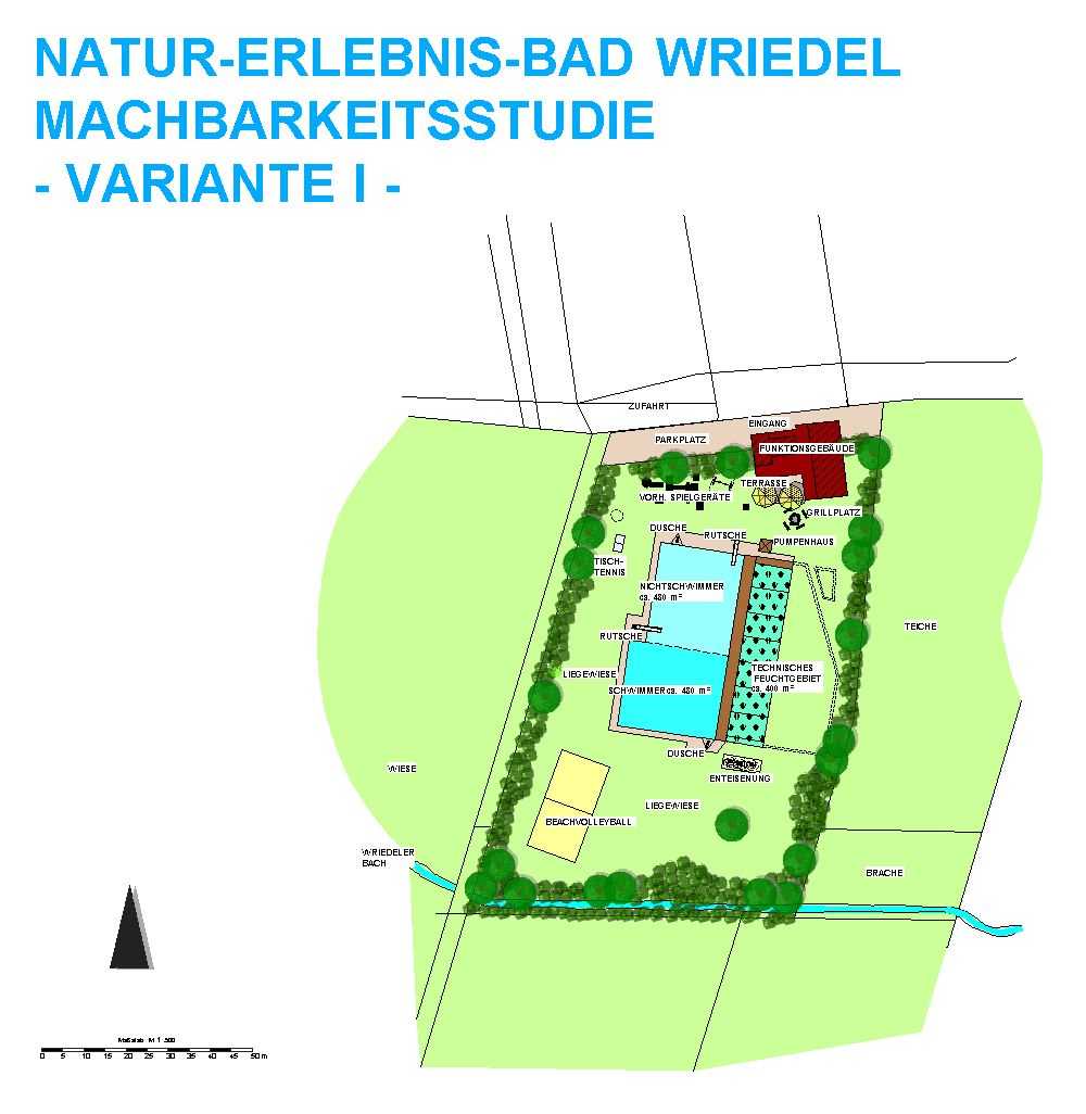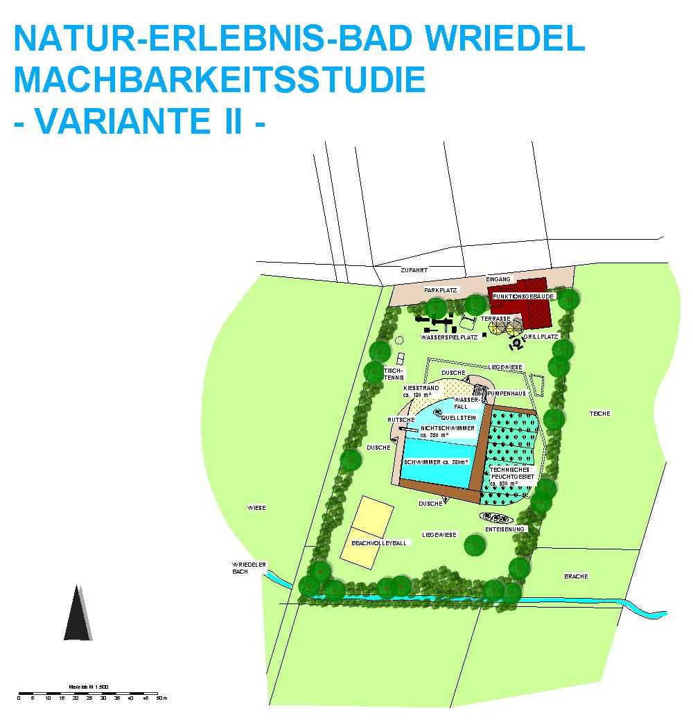 | Ausstattung Var. II: | Bekiesung Nichtschwimmerbereich, Steganlage aus Lärchenholz, Quellstein im Nichtschwimmerbereich, Wasserfall, Kiesstrand Grillplatz, Enteisenungsanlage |