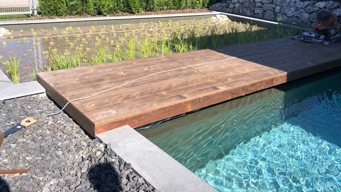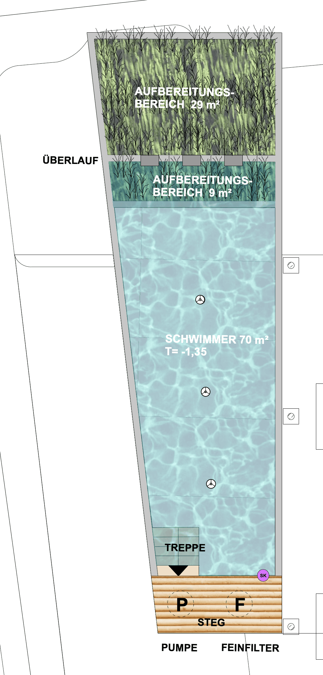 | Wasseraufbereitung | vollbiologisch über Filterkombination Hydrobot. Anlage/Kiesfilter mit horizontaler/vertikaler Durchströmung |