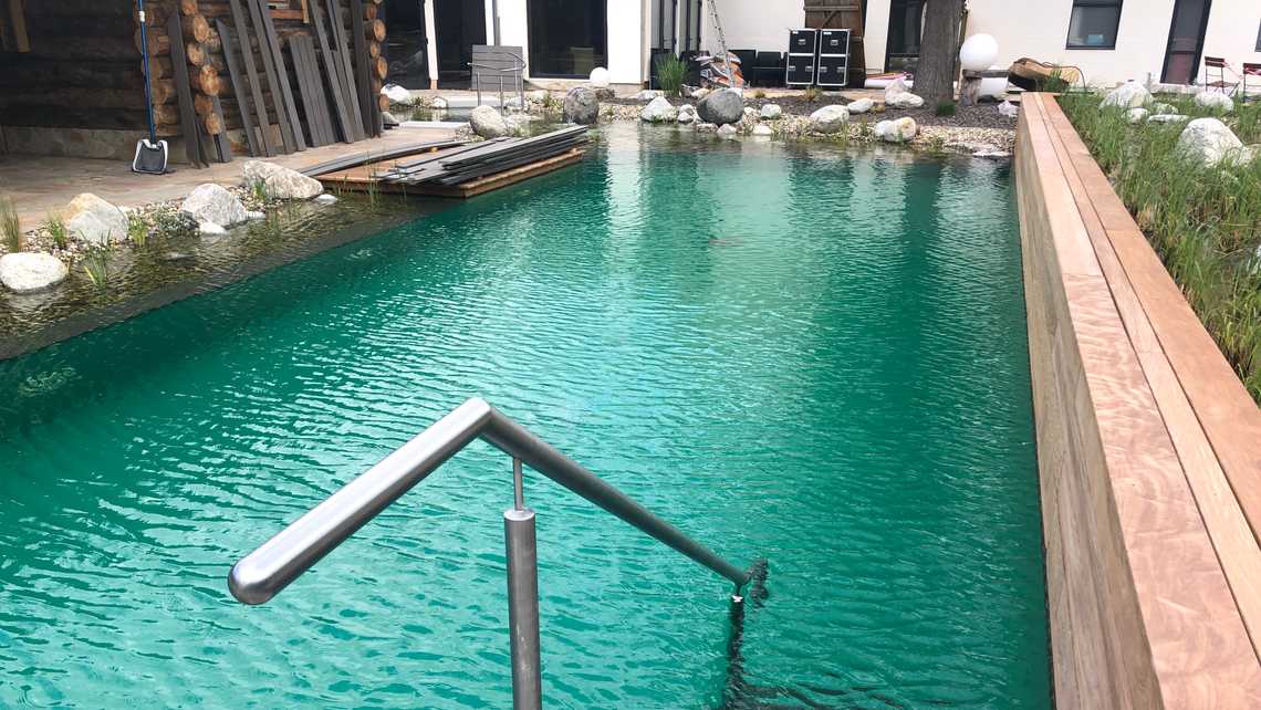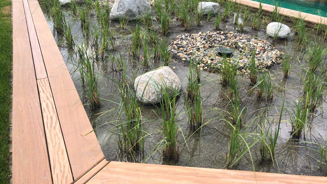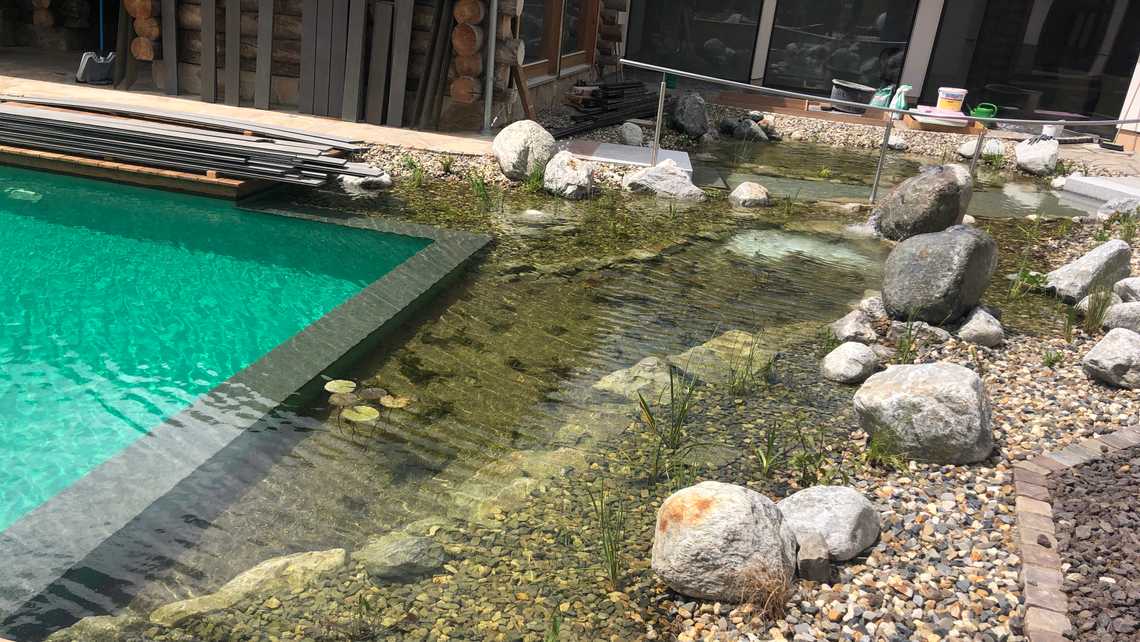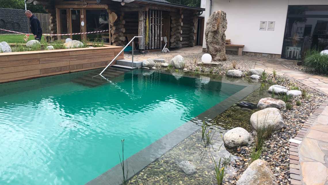 | Bauweise | Sanierung gem. FLL Richtlinie für vollbiologische Wasseraufbereitung, 2-Kammer-System |