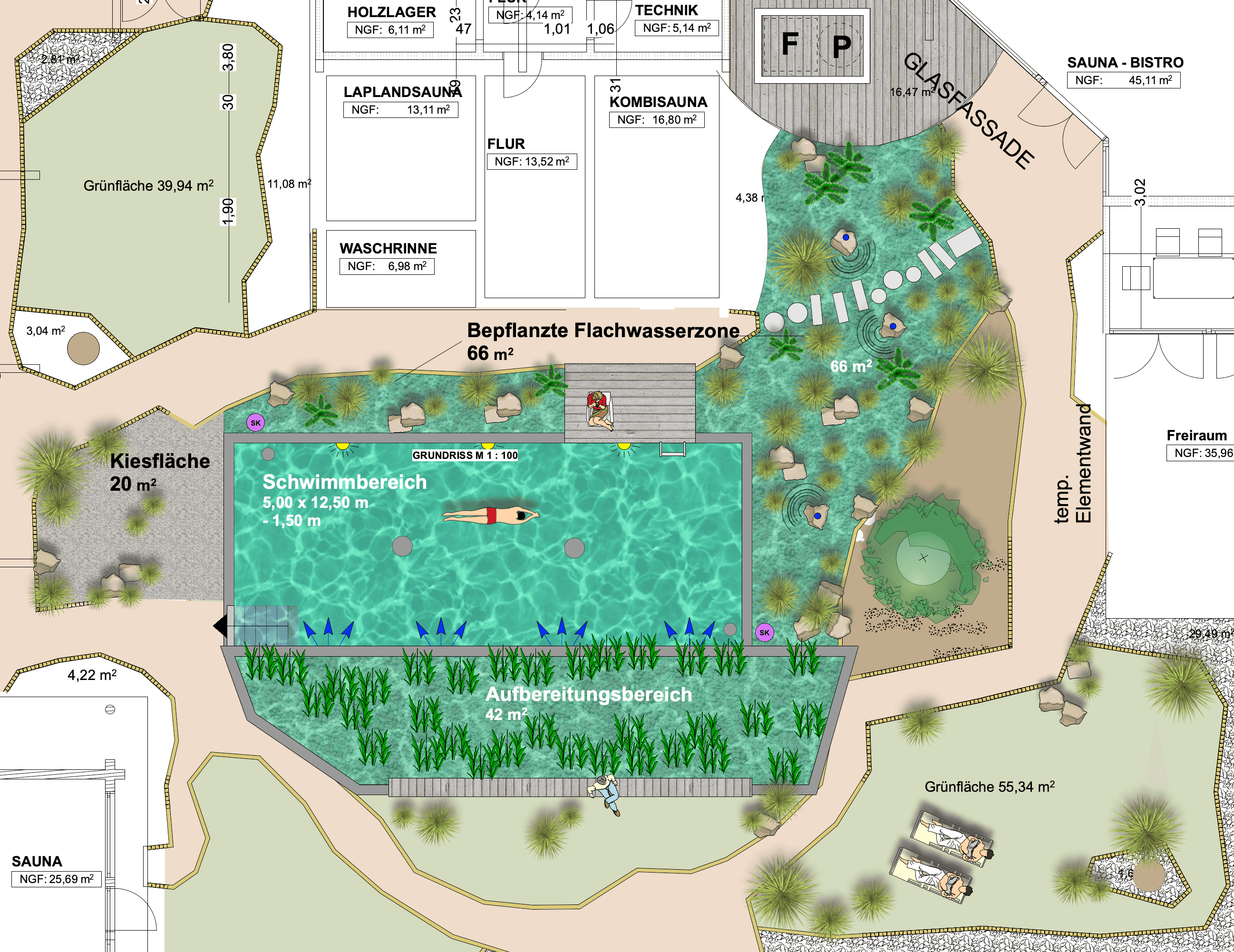 | Wasseraufbereitung | vollbiologisch über Filterkombination Hydrobot. Anlage/Kiesfilter mit horizontaler/vertikaler Durchströmung |