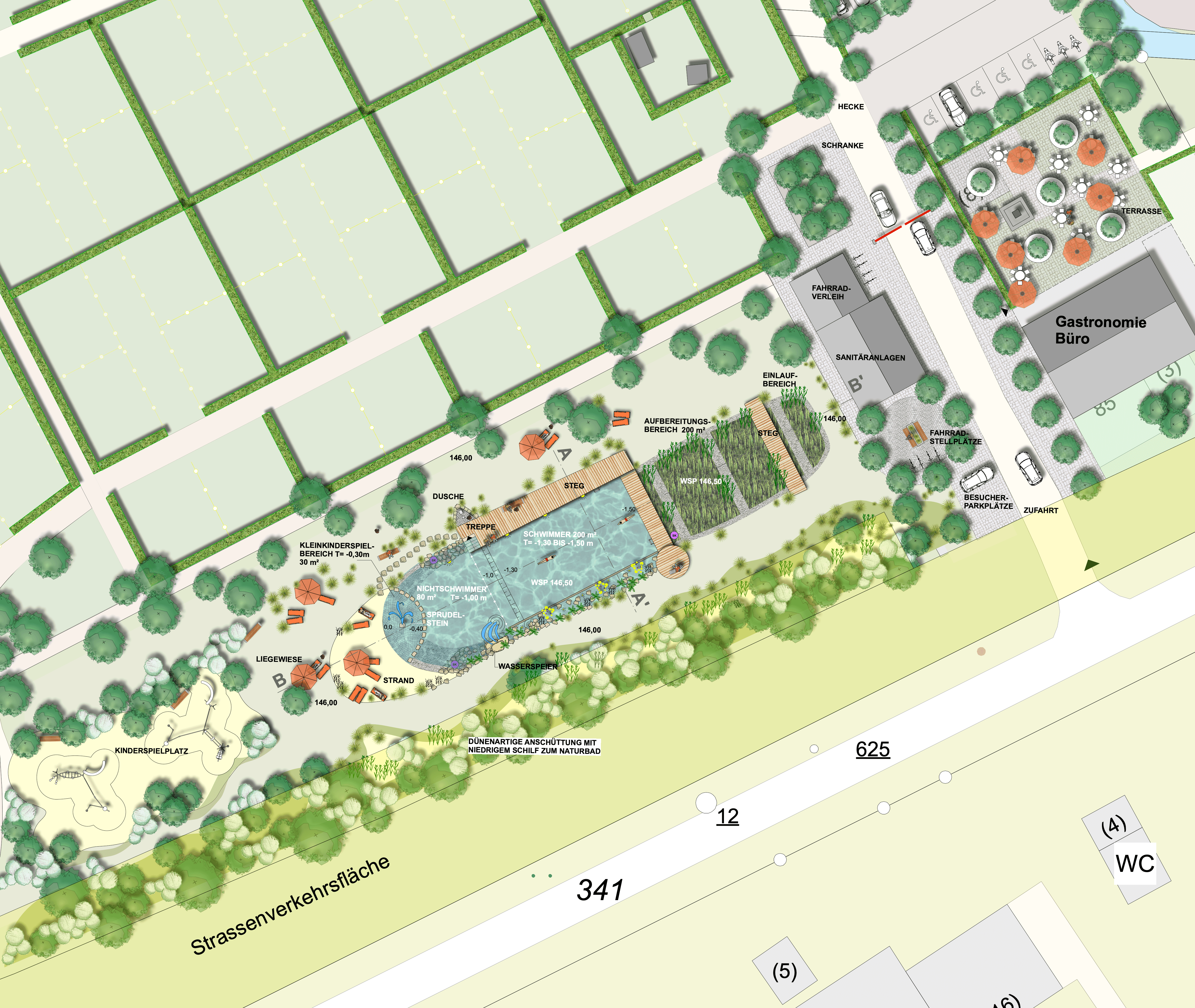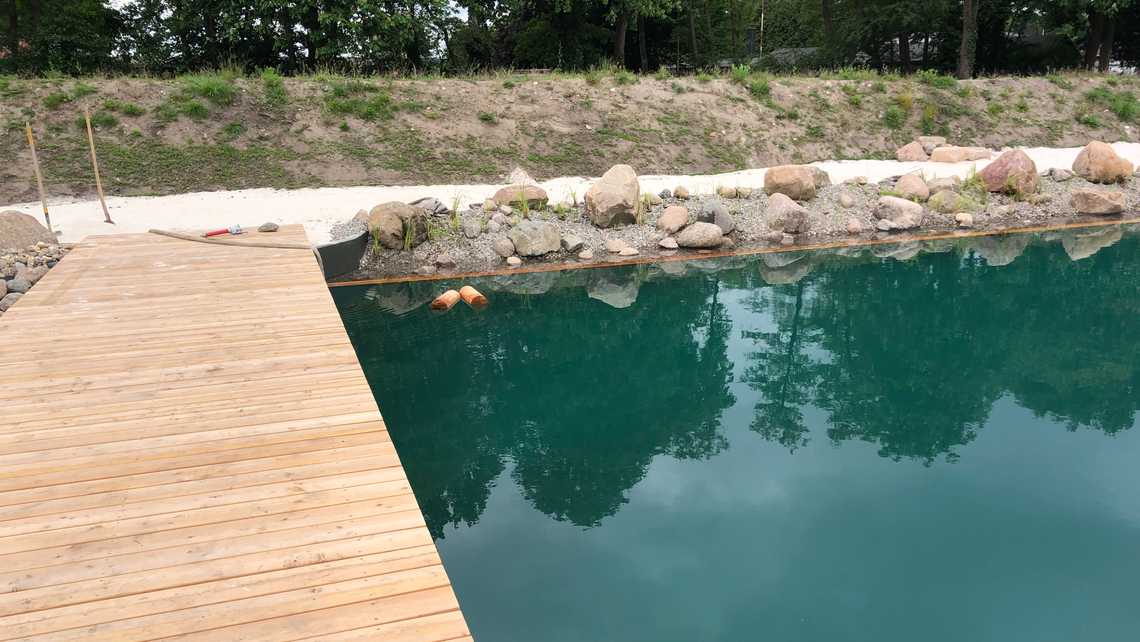 | Ausstattung | vier 20-m-Schwimmbahnen, Holzstege aus Lärchenholz, Sandstrand, Sprudelsteine im NS-Bereich, Kinderbecken mit Sprudelsteinen, Kinderspielplatz |