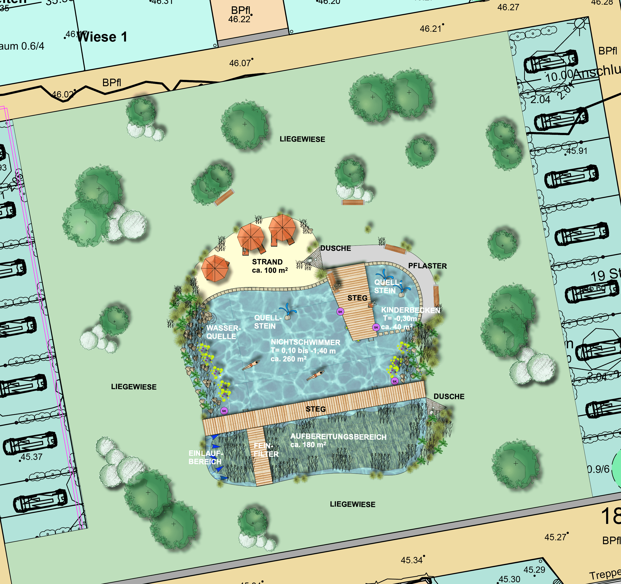 | Ausstattung | Holzstege aus Lärchenholz, Sandstrand, Sprudelsteine im NS-Bereich, Kinderbecken mit Sprudelsteinen, Sandstrand |