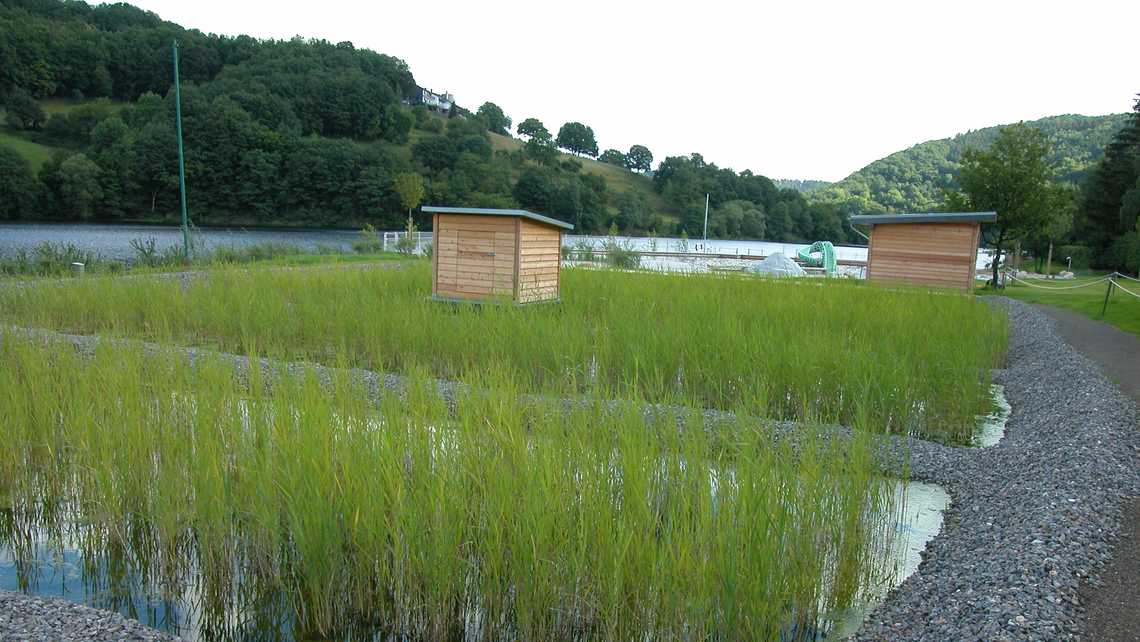 | Wasseraufbereitung | vollbiologisch über techn. Feuchtgebiet (Constructed Wetland) mit horizontaler Durchströmung |
