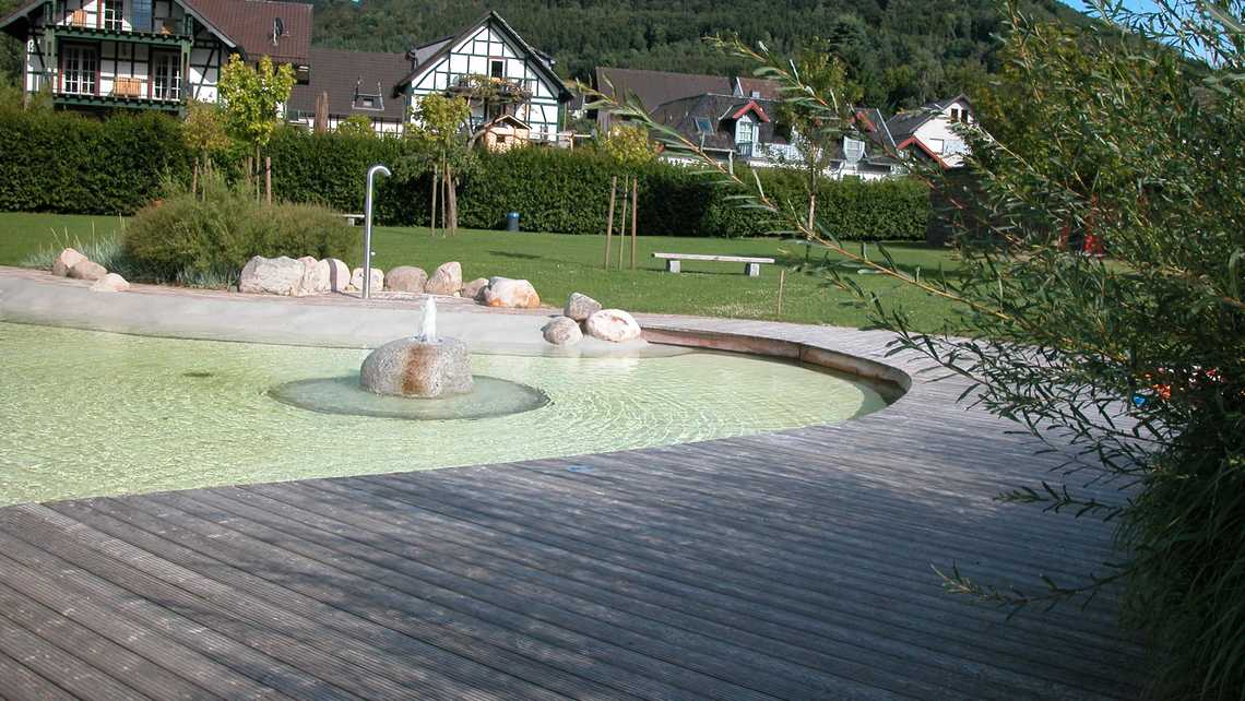 | Ausstattung | Holzstegen aus Lärchenholz um den NS-Bereich, großer Kiesstrand, Geysier im NS-Bereich, Wasserfall, Rutsche im Nichtschwimmerbereich, Kinderbecken mit Quellhügel, Sprudelstein, Sprühschlange und Kleinkindrutsche, Wasserpielplatz, Boccia, Beachvolleyball |