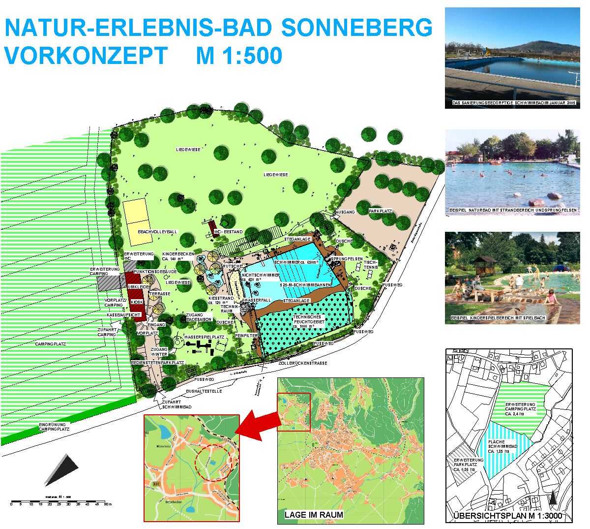 | Ausstattung | fünf 25-m-Schwimmbahnen, Sprungfelsen mit 1/3-m-Plattform, Holzstegen aus Lärchenholz, Kiesstrand, drei Sprudelsteine im NS-Bereich, Wasserfall, Badeinsel mit Zugang über Trittsteine, Kinderbecken mit Bachlauf, Sprudelsteinen, Sprühschlange und Kleinkindrutsche, Wasserspielplatz, Beachvolleyball, Tischtennis. |
