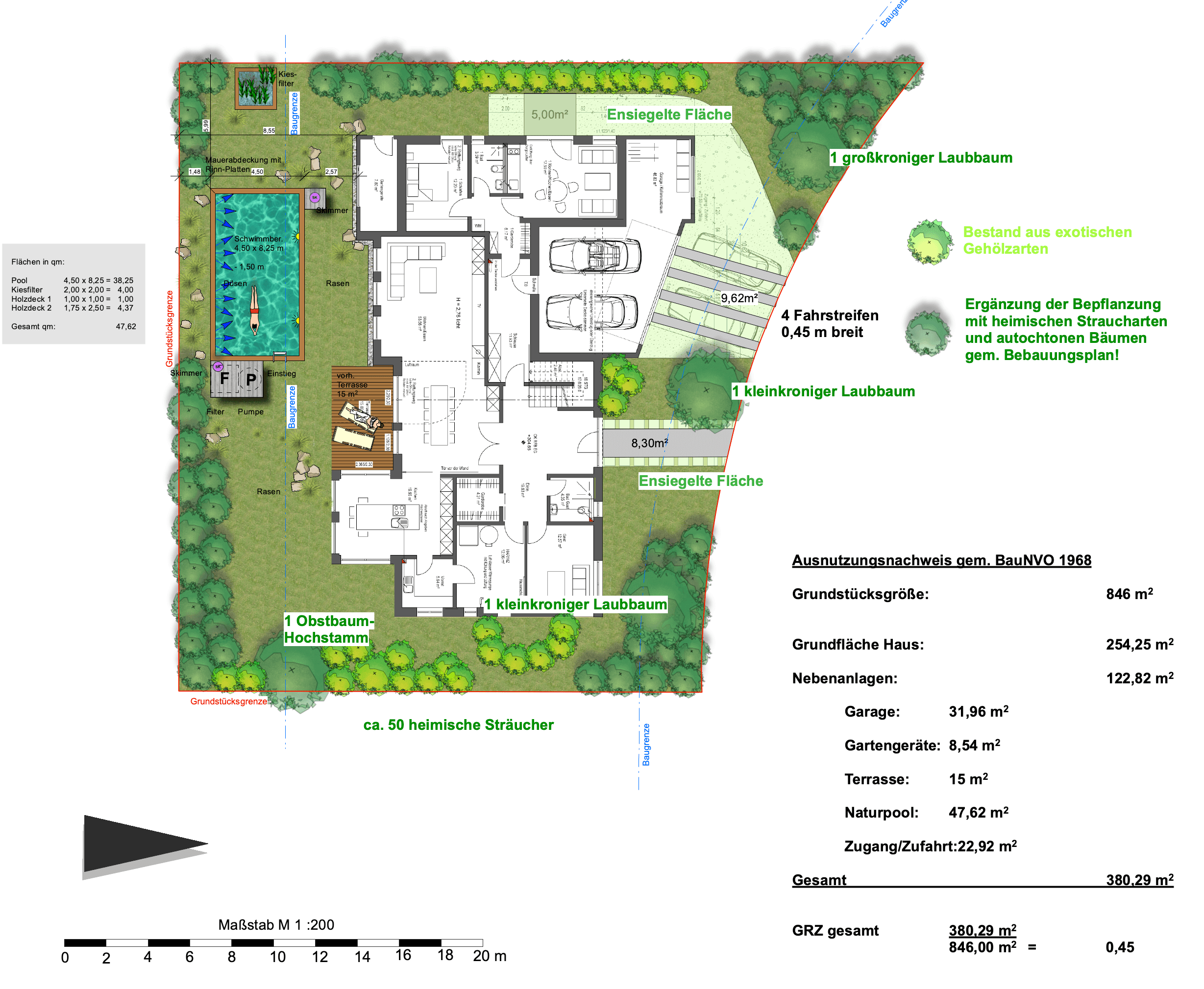 | Wasseraufbereitung | vollbiologisch über Filterkombination Hydrobot. Anlage/Kiesfilter mit horizontaler/vertikaler Durchströmung |